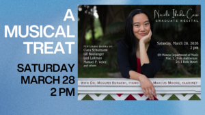 Come see Nikki Ikeda Cossi at her graduate recital on Saturday, March 28, at 2:00 PM in the Orvis Auditorium at UH Mānoa, featuring works by Clara Schumann, Lili Boulanger, Lori Laitman, Manuel P. Velez, and others. She will be accompanied by Dr. Megumi Kurachi on piano and Marcus Moore on clarinet.