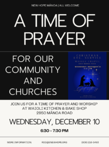 Join us on Wednesday, December 10, 6:30-7:30 PM for a time of prayer and worship at Waioli Kitchen & Bakeshop.