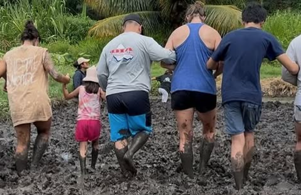 - Boots or covered shoes recommended for those doing work outside of the loʻi. High zip up tabis, high socks, or barefoot + slippers for after for those going into the loʻi