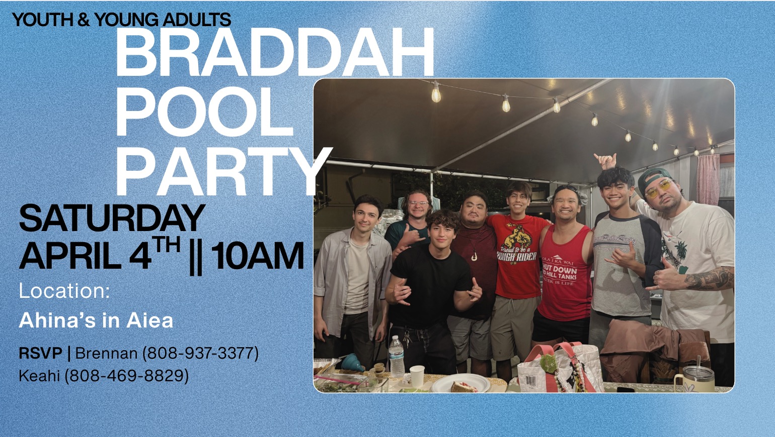 Youth and Young Adult Pool Party for all the braddahs on Saturday, April 4, 10:00 AM at the Ahina’s in ‘Aiea. Please RSVP with Brennan or Keahi.